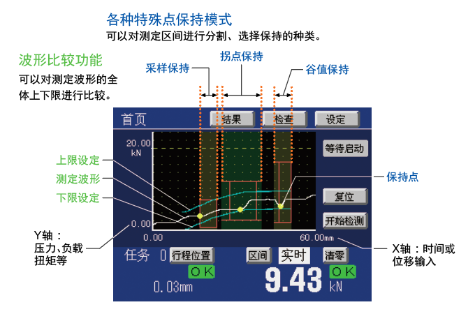 将检测波形分割为测定区间,可以任意切换各种保持功能(采样‧峰值‧谷值‧P-P‧相对峰值‧相对谷值‧拐点)并进行独立的判断。可以根据区间任意指定上限值,下限值,保持的种类等。通过对压入刚刚开始的异常作为峰值保持,将压入到底之前的负荷作为拐点保持,可以作出对同一个工序的复数点的合格与否的判断。