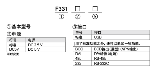 | USB接口 BCD并行数据输出接口(漏型)(选件) D/A转换器接口(电流输出)(选件) RS-485通信接口(Modbus-RTU、UNI-Format)(选件) RS-232C通信接口(选件) |