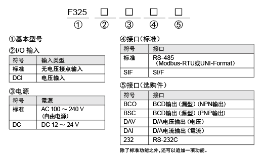 | RS-485通讯接口(Modbus-RTU或UNIPULSE格式)或SI/F(UNIPULSE格式开发串行接口) BCD输出接口(漏型NPN)(选购件) BCD输出接口(源型PNP)(选购件) D/A转换(电压输出)(选购件) D/A转换(电流输出)(选购件) RS-232C通讯接口(选购件) |