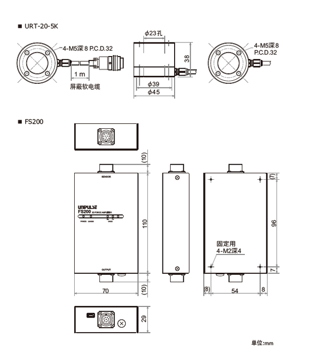 ※上述参数为传感器(URT-20-5K)与专用测力仪表(FS200)配套使用时的参数。