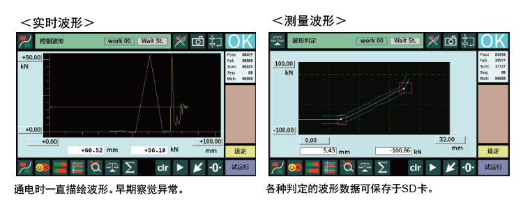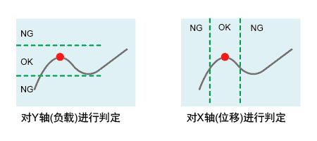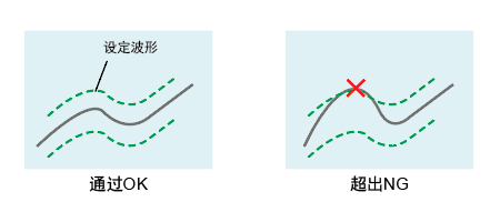 上下限的设定波形和实际的测定波形进行比较。 测定波形的全体作为上下限波形的比较对象, 有一个测定点超过设定波形既是NOK |