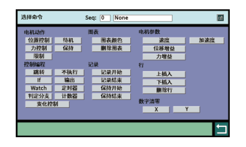| 指令 | 电机动作:位置控制/力控制/待机 控制语句:空栏/jump/if/watch/输出/判定分歧 波形:波形颜色/波形删除 记录:检测开始/检测结束/保持开始/保持结束 电机参数:加速度/位置比例增益/力比例增益 行:向上插入/向下插入/删除行 数字偏移:X/Y |